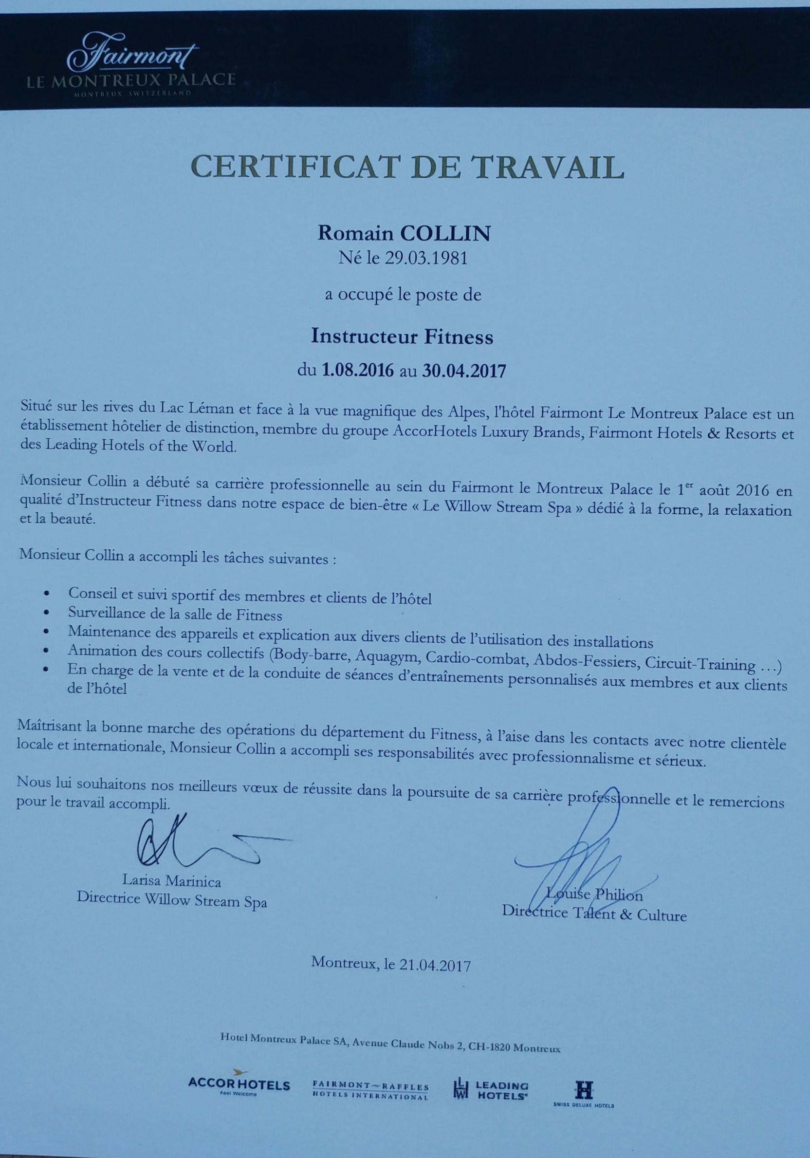 Grâce à une expérience diversifiée, j'ai eu le privilège de collaborer avec un public varié, intervenant aussi bien dans des structures de remise en forme, écoles ou des communes que dans des hôtels 5 étoiles (Le montreux palace par exemple...voir le certificat)
